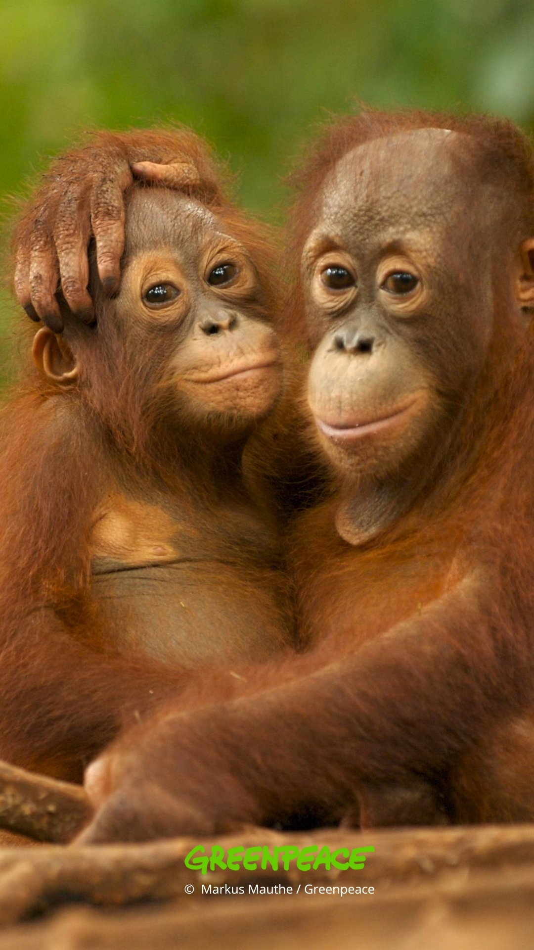 Young orangutans hugging in Nyaru Menteng, Borneo