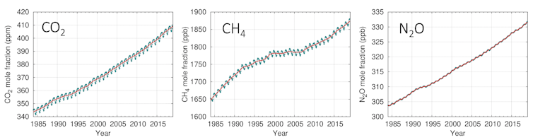 Concentrations of the three main greenhouse gases – carbon dioxide (CO₂), methane (CH₄) and nitrous oxide (N₂O), have all increased over the past decade. Current concentrations in the atmosphere are, respectively, 147%, 259% and 123% of those present before the industrial era began in 1750.
