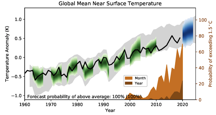There’s a one-in-four chance the global annual average temperature will exceed 1.5℃ above pre-industrial levels for at least one year over the next five years. The chance is relatively small, but still significant and growing. If a major climate anomaly, such as a strong El Niño, occurs in that period, the 1.5℃ threshold is more likely to be crossed. El Niño events generally bring warmer global temperatures.