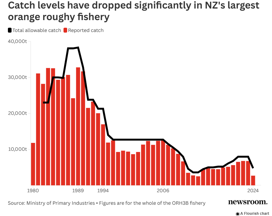On July 2 2025 it was revealed that the biggest orange roughy fishery had collapsed down to 8% to 18% of original biomass and the Ministry of Primary Industry was consulting on options to cut quota. As usual this quota reduction proposal came after the fishery collapsed, when the industry could no longer land their quota. The overfished orange roughy fishery had been in a bad state for some time. In November 2023 the industry was forced to relinquish the blue tick provided by the greenwashing organisation Marine Stewardship Council. The representative of the deepwater fishing firms said at the time that they didn’t believe there was a sustainability issue!