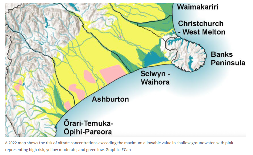 On September 11 2025 the Canterbury Regional Council revealed that half of private drinking water bore tests in the Selwyn district were over the legal limit for nitrate pollution (which is itself eleven times above the level that increases rates of colorectal cancer).
