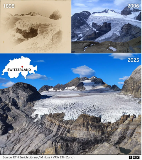 El glaciar Clariden, en el noreste de Suiza, se mantuvo aproximadamente en equilibrio hasta finales del siglo XX – ganando tanto hielo por las nevadas como el que perdía por el deshielo -. Pero en este siglo, se ha derretido rápidamente.