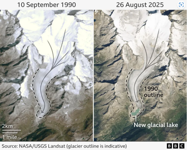 La nota de la BBC comparte imágenes satelitales de varios casos de glaciares que se contrajeron e incluso desaparecieron en los últimos años. El primer ejemplo es el del Rhône, que es claro cómo ha cambiado desde 1990. Se ve claramente cómo frente al glaciar hay un lago donde antes solía haber hielo.