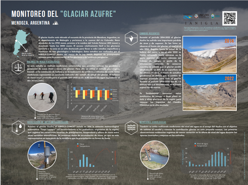 Durante el periodo 2014-2022 el glaciar Azufre ha sufrido una importante pérdida de área y de espesor. A partir de la información obtenida de sensores remotos, se calculó que el glaciar perdió alrededor de un 50% de su superficie en los últimos 20 años. Se estimó que el derretimiento en el frente superó los 60 metros.