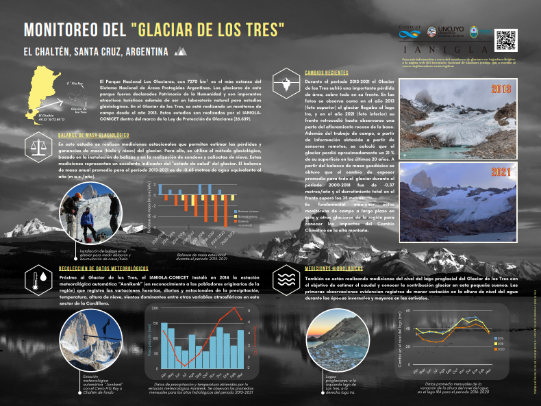 Durante el periodo 2013-2021 el Glaciar de los Tres sufrió una importante pérdida de área, sobre todo en su frente. Se estimó que el derretimiento total en el frente superó los 35 metros.