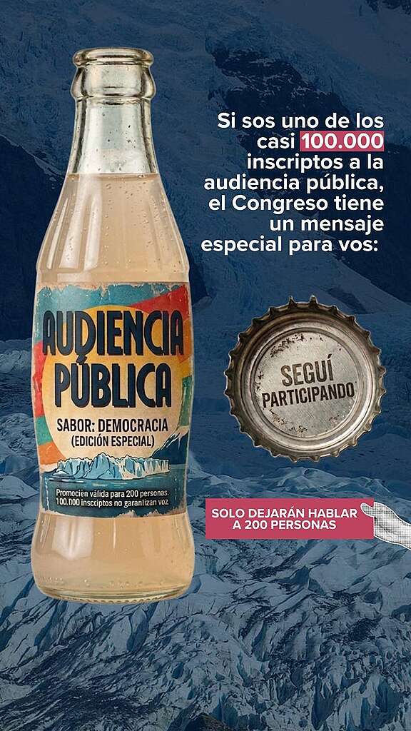 Casi 100.000 personas de todo el país se inscribieron para participar en la audiencia pública por la reforma de la Ley de Glaciares. Pero, mientras más queremos hablar para defender el agua y los glaciares, más nos quieren restringir, limitar,entorpecer y silenciar. No podemos permitirlo.