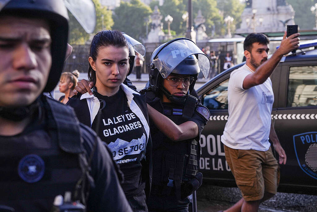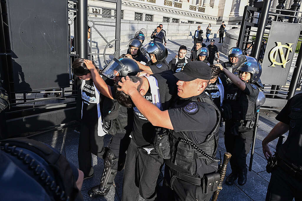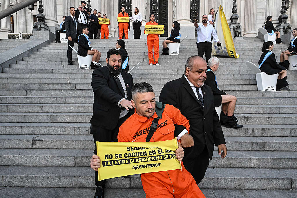 “Nuestra protesta fue pacífica y tuvo un objetivo claro: advertir que esta reforma debilita los presupuestos mínimos que durante más de quince años protegieron los glaciares como reservas estratégicas de agua en Argentina. Lo que hoy se discute en el Senado no es un detalle técnico, sino la posibilidad de reducir el estándar nacional que garantiza que estas fuentes de agua dulce no queden sujetas a decisiones discrecionales de las provincias. Eso implicará un retroceso en la seguridad hídrica del país y en la protección de un bien común esencial”, sostuvo Diego Salas, director de programas de Greenpeace.