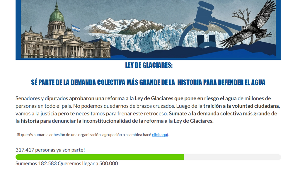 Buenos Aires, 9 de abril de 2026- En el primer día tras la aprobación de la reforma de la ley de glaciares, la demanda colectiva que impulsan las organizaciones de la sociedad civil alcanzó un número récord de adhesiones, superando todas las expectativas; más de 300 mil personas se sumaron a esta iniciativa que ya se perfila como la demanda colectiva más grande de la historia.