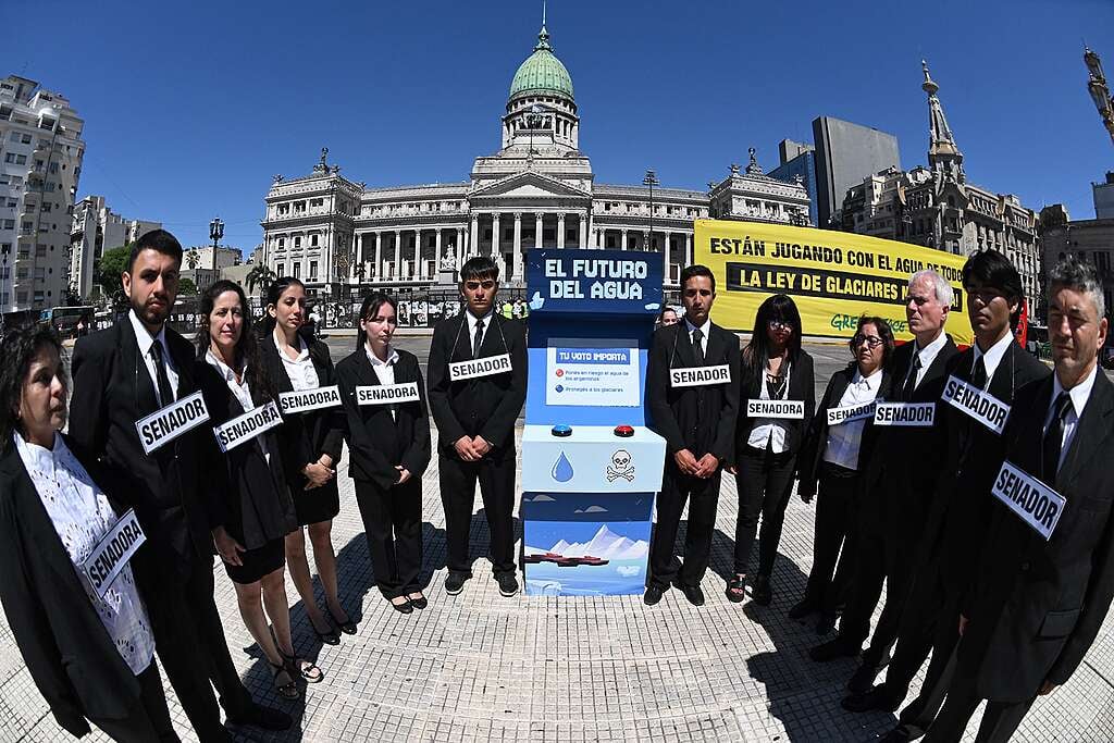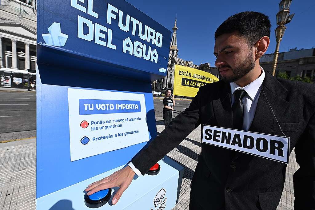 Con una intervención creativa, activistas de la organización se acercaron hoy al Congreso para realizar un simulacro de votación mediante un dispositivo similar a un videojuego, que representa de forma simbólica las discusiones que se darán en el ámbito legislativo los próximos días. La acción, cuyo lema fue “Están jugando con el agua de todos. La Ley de Glaciares no se toca” representó una puesta en escena clara y directa para evidenciar las consecuencias ambientales de los cambios que se proponen y el riesgo de convertir límites ambientales claros en decisiones negociables.