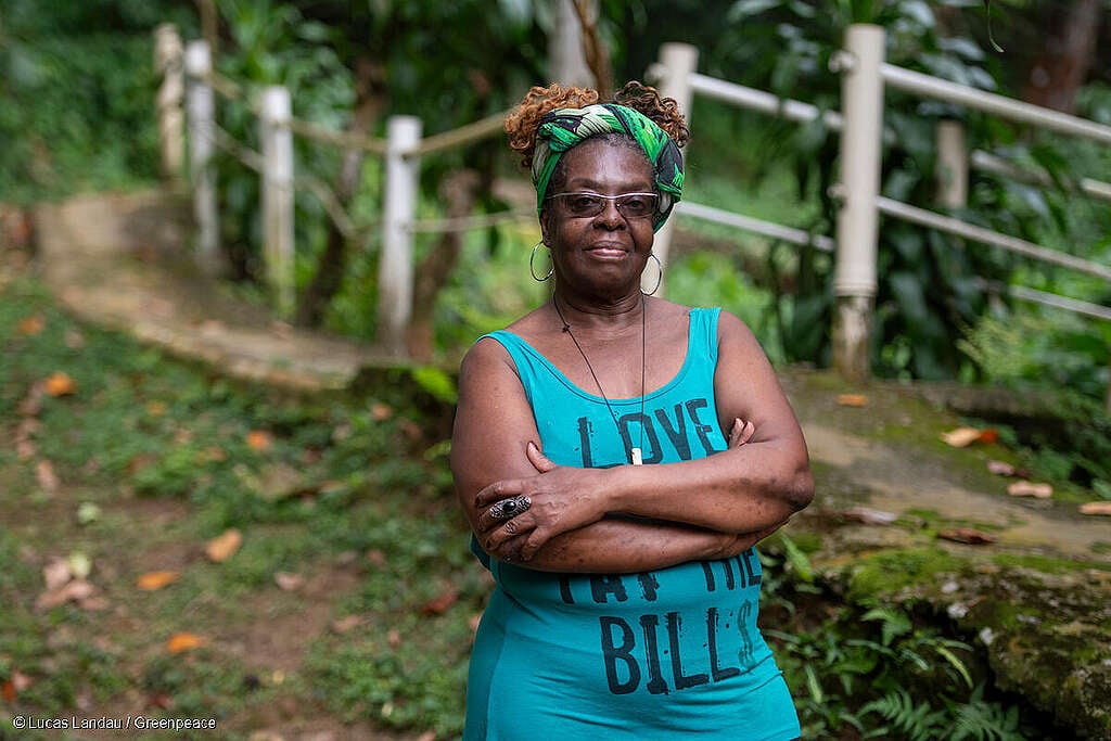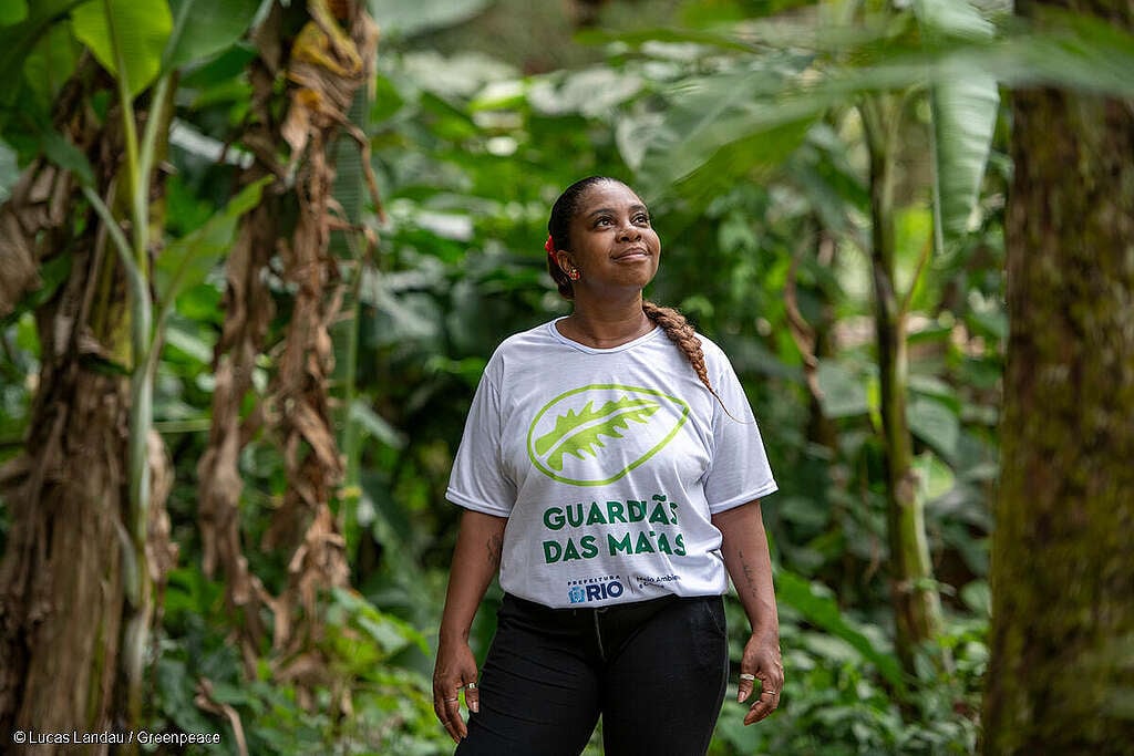 Janaína de Souza Gama, moradora da Comunidade do Horto, trabalha como Guardiã da Mata. O programa Guardiãs da Mata, da Prefeitura do Rio de Janeiro, capacita mulheres para mapear, acompanhar e fiscalizar áreas verdes, atuando como guardiãs que alertam sobre o desmatamento e outros problemas ambientais.