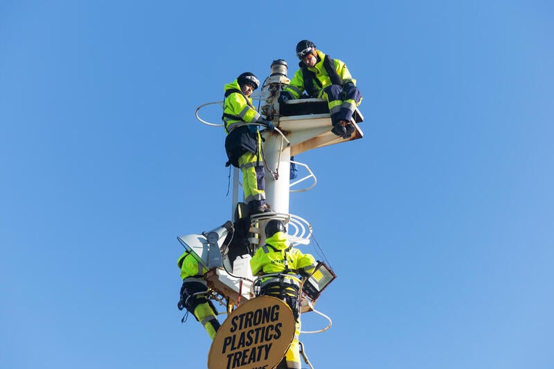 Durante as negociações sobre o Tratado Global de Plásticos em Busan, os ativistas escalaram o mastro de um navio petroquímico prestes a transportar plásticos tóxicos no complexo Hyundai Daesan Refinery, na Coreia do Sul.