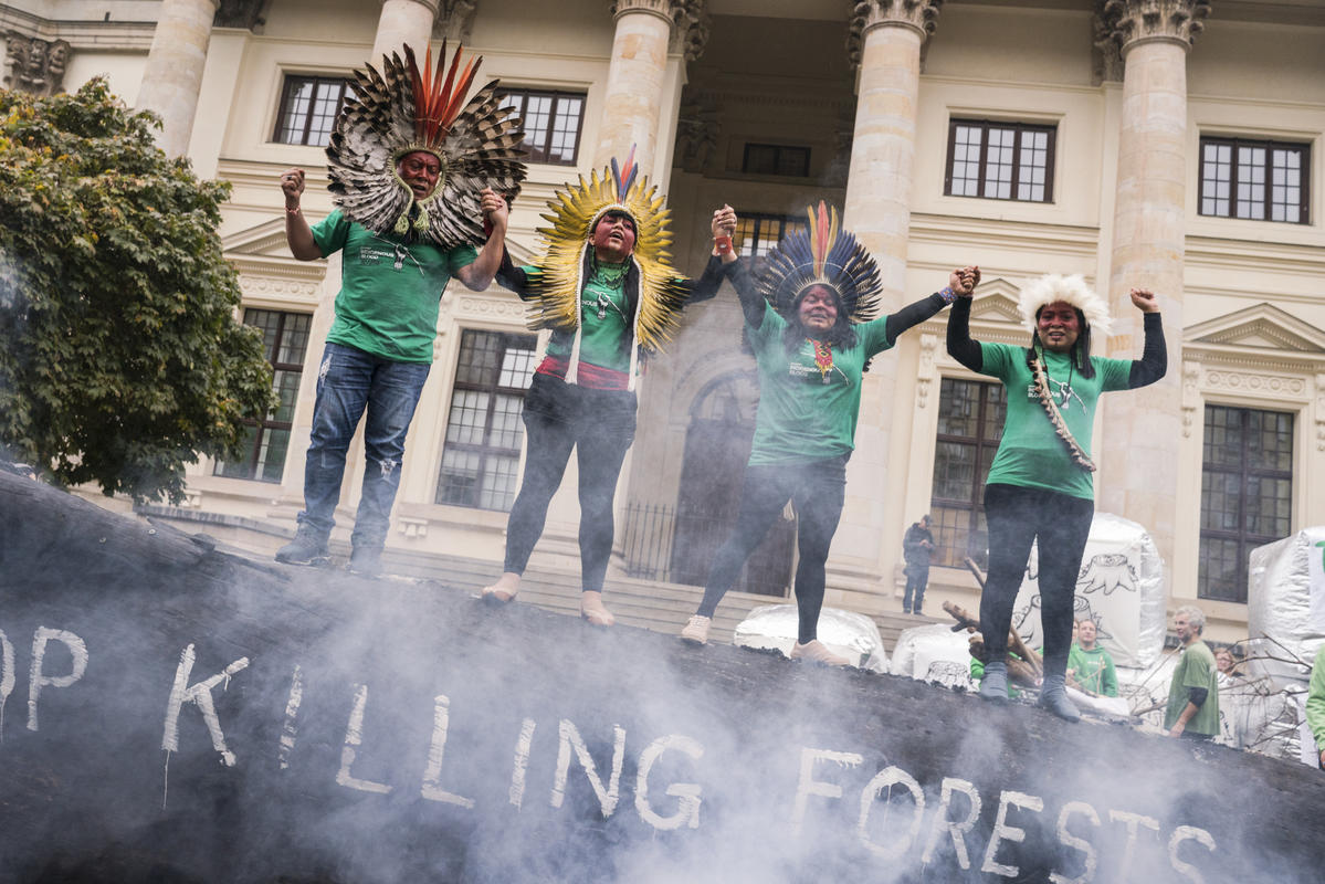Durante o protesto pacífico, ativistas do Greenpeace Alemanha levaram um tronco queimando com as palavras “parem de matar as florestas”, como uma forma de simbolizar as queimadas que vêm destruindo a floresta Amazônica para dar lugar a grileiros, ao agronegócio irresponsável e ao garimpo ilegal.