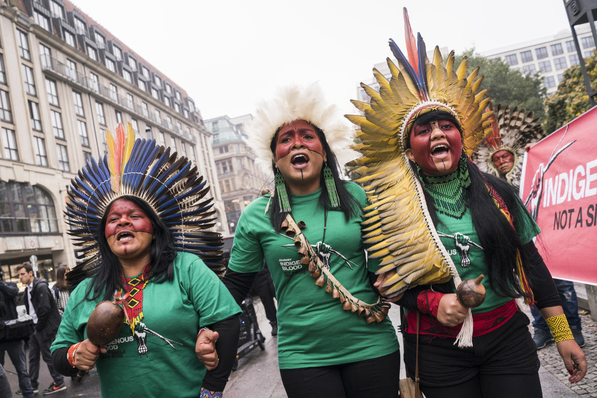 As lideranças da “Jornada Sangue Indígena: Nenhuma Gota a Mais”, realizada pela Articulação dos Povos Indígenas do Brasil (Apib), protestaram pacificamente nesta quinta (24), em Berlim, em frente ao edifício onde ocorria a reunião de sustentabilidade do Consumer Goods Forum (CGF) – uma cúpula formada pelas maiores indústrias alimentícias do mundo.