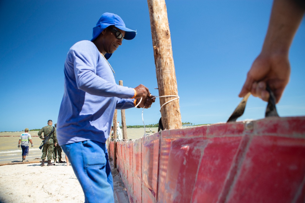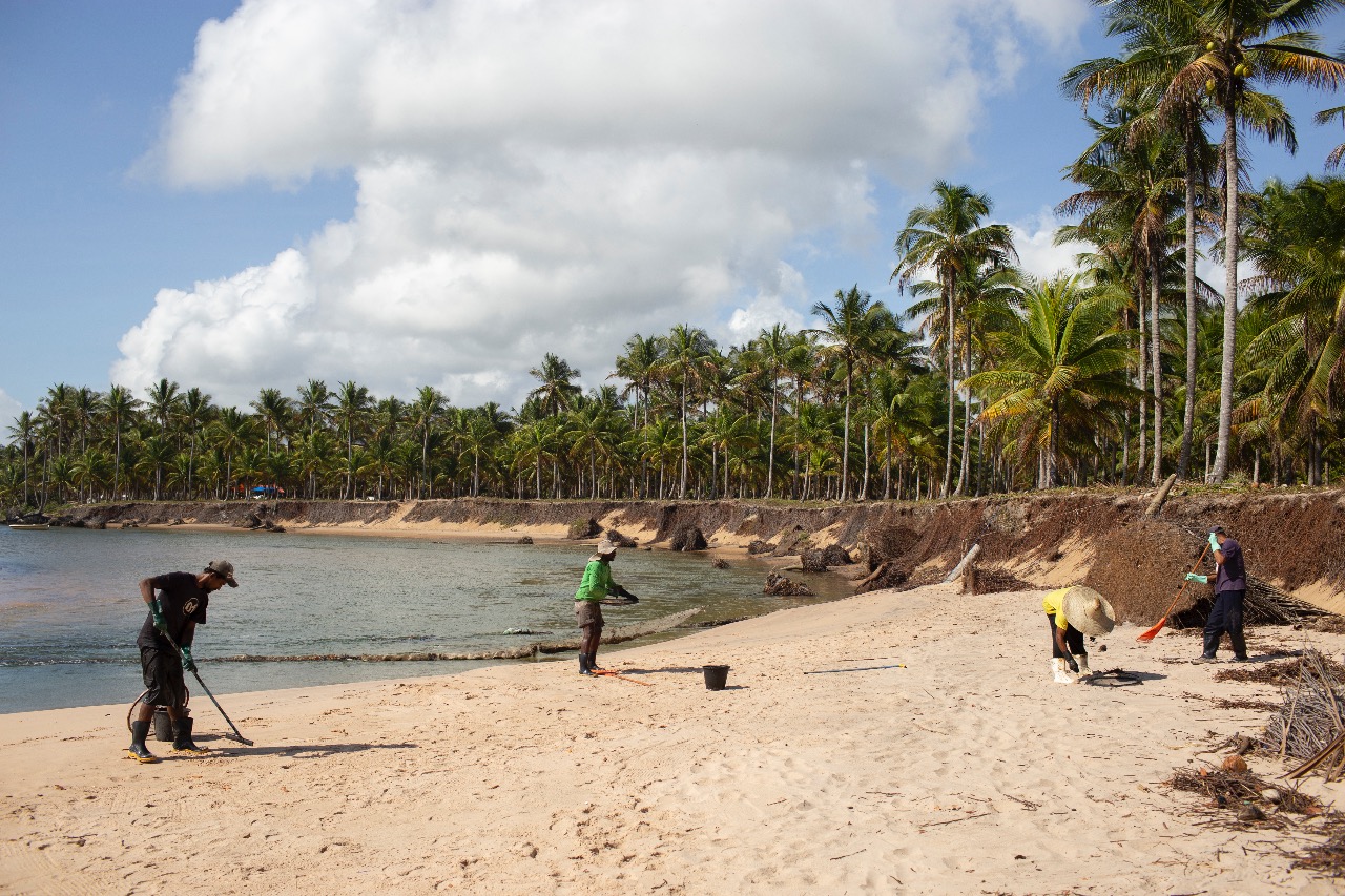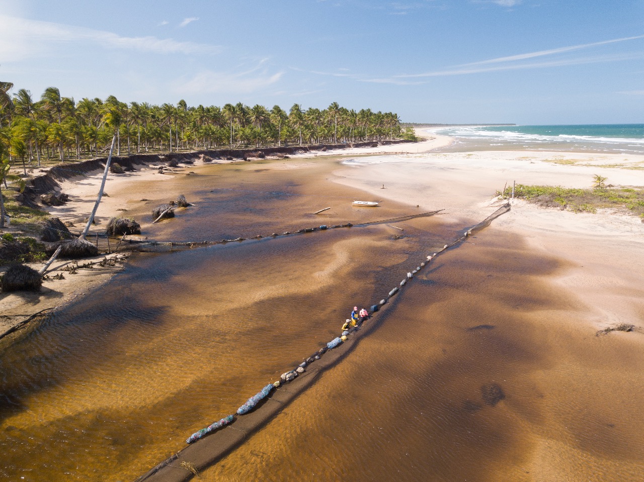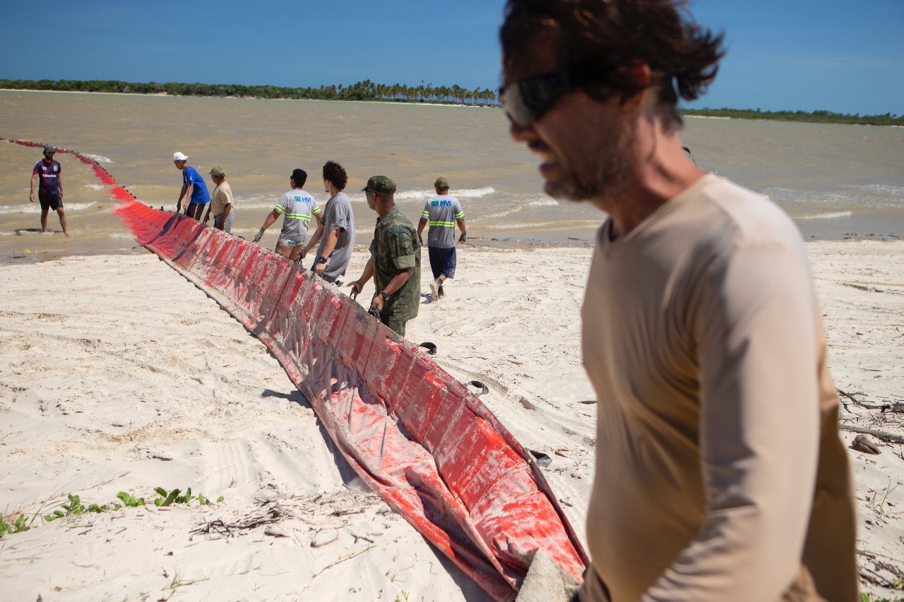 Em Piracanga, na península de Maraú, o fotógrafo Willians Gomes reuniu uma equipe de moradores para desenvolverem, juntos, uma ecobarreira, criando filtros que barram a entrada do óleo e permitem a passagem de peixes e outros animais marinhos pela foz do rio Piracanga.