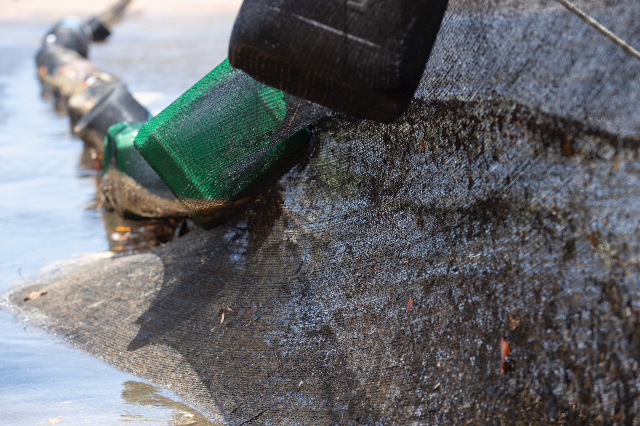 Quando os primeiros fragmentos de óleo apareceram, a barreira foi rapidamente construída com materiais que tinham disponíveis. São quatro redes de contenção, feitas com sombrite (uma tela de plástico, usada em viveiros de plantas), cascas de coco (que são abundantes na região) e garrafas de plástico (colhidas nas ruas). Dois últimos filtros feitos de manta absorvente ainda serão instalados para captar partículas menores do óleo.