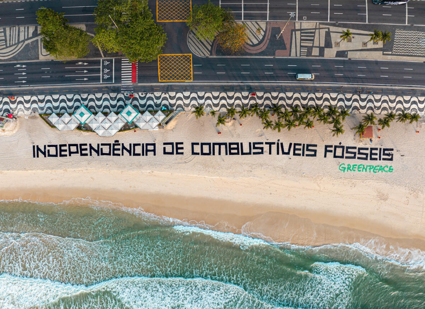 Nas areias da praia de Copacabana, no Rio de Janeiro, ativistas do Greenpeace Brasil montaram uma frase gigante, de 150 metros de extensão, com os dizeres: “Independência de Combustíveis Fósseis”, uma alusão ao 07 de setembro, data em que o Brasil comemora a independência do país.