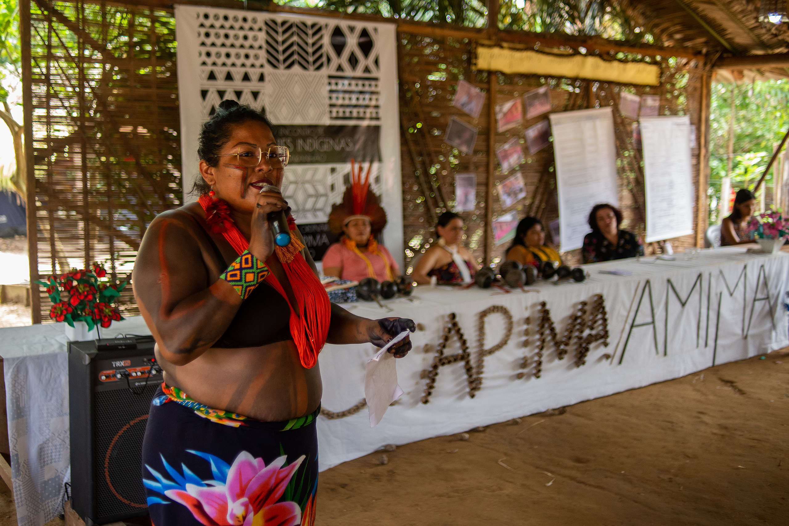 “A resistência é nossa própria essência. A diversidade da floresta está presente também aqui, na diversidade de nossos povos e culturas. Precisamos fortalecer nossa unidade nesta diversidade porque sem nossas terras e nossos direitos, como cuidaremos de nossos filhos? ”, questionou Nara Baré, representando a Coordenação das Organizações Indígenas da Amazônia Brasileira (Coiab).