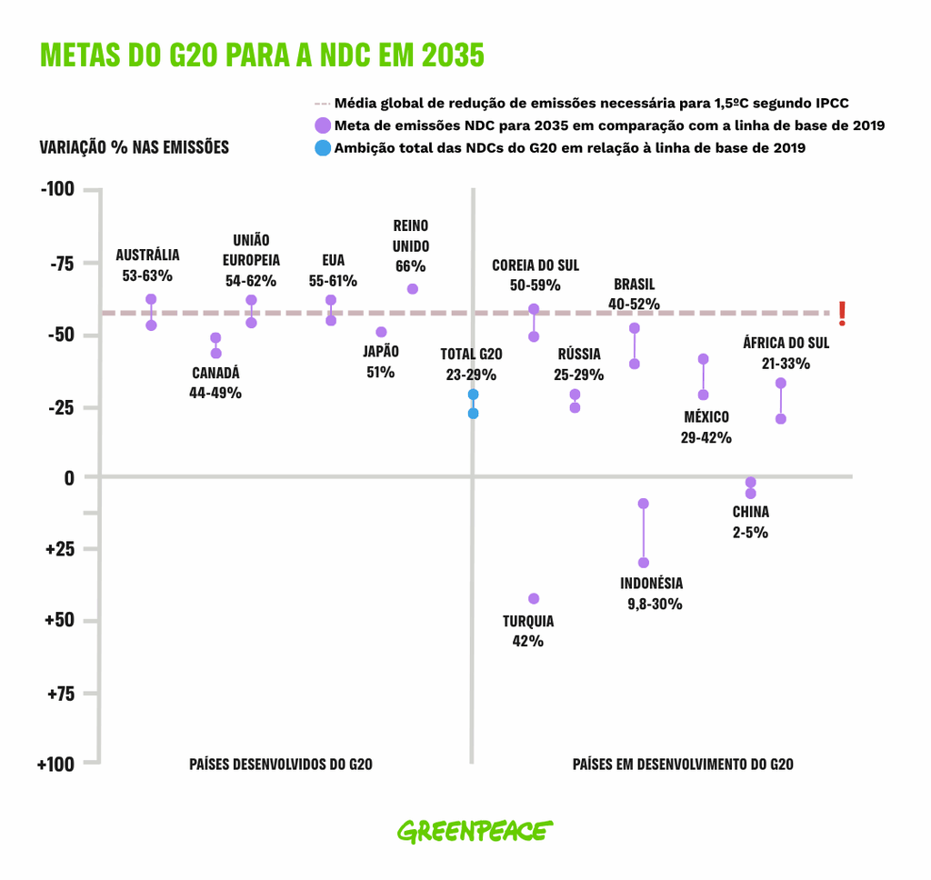 “Dada a sua responsabilidade histórica pelas emissões e a sua maior capacidade de agir, os países desenvolvidos do G20 deveriam estar na vanguarda, reduzindo as emissões muito além da média global de 60% necessária, assim como deveriam providenciar financiamento para países em desenvolvimento cumprirem suas metas climáticas. Diante de eventos extremos cada vez mais frequentes e perigosos, limitar o aquecimento da Terra a 1.5º C não é uma opção, mas uma condição para a vida de todos nós”, comenta a diretora executiva do Greenpeace Brasil, Carolina Pasquali.