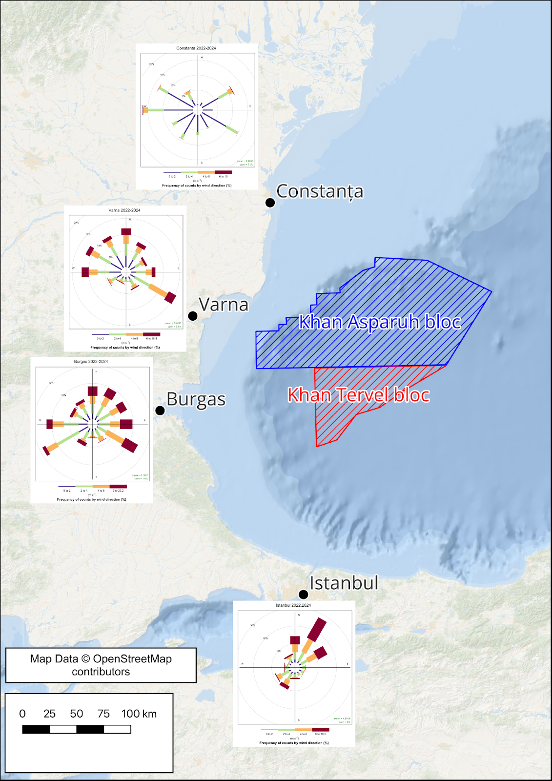 Малките графики показват колко често вятърът духа към крайбрежните градове от всяка посока. Данните показват, че ветровете духат от районите на Черно море, където може да се построят платформи, към градовете на брега, където живеят стотици хиляди граждани.