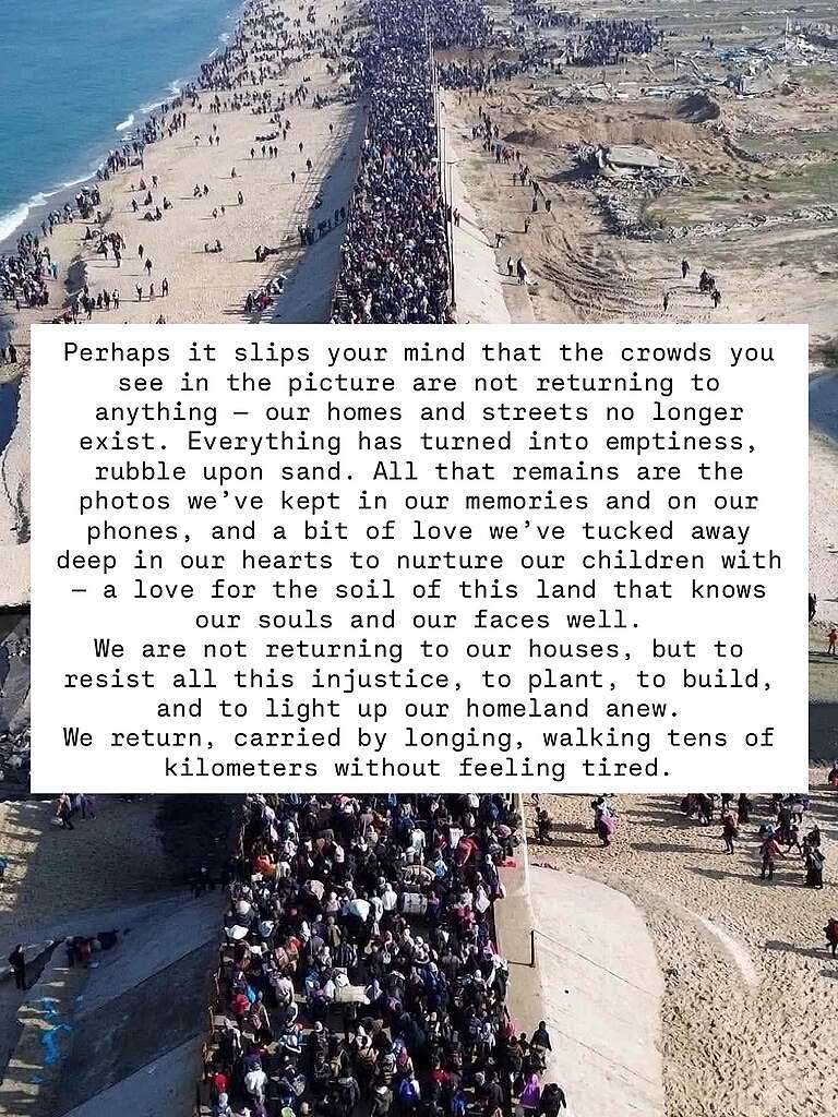 What follows is devastation. An ocean of grief for Gaza, for what was lost, erased, annihilated. Ninety-two percent of its people have no home to return to. Hundreds of bodies are still being pulled from the rubble. Fifty-eight thousand children are now orphans, and there are more child amputees in Gaza than anywhere else in the world. No language can hold this kind of pain.