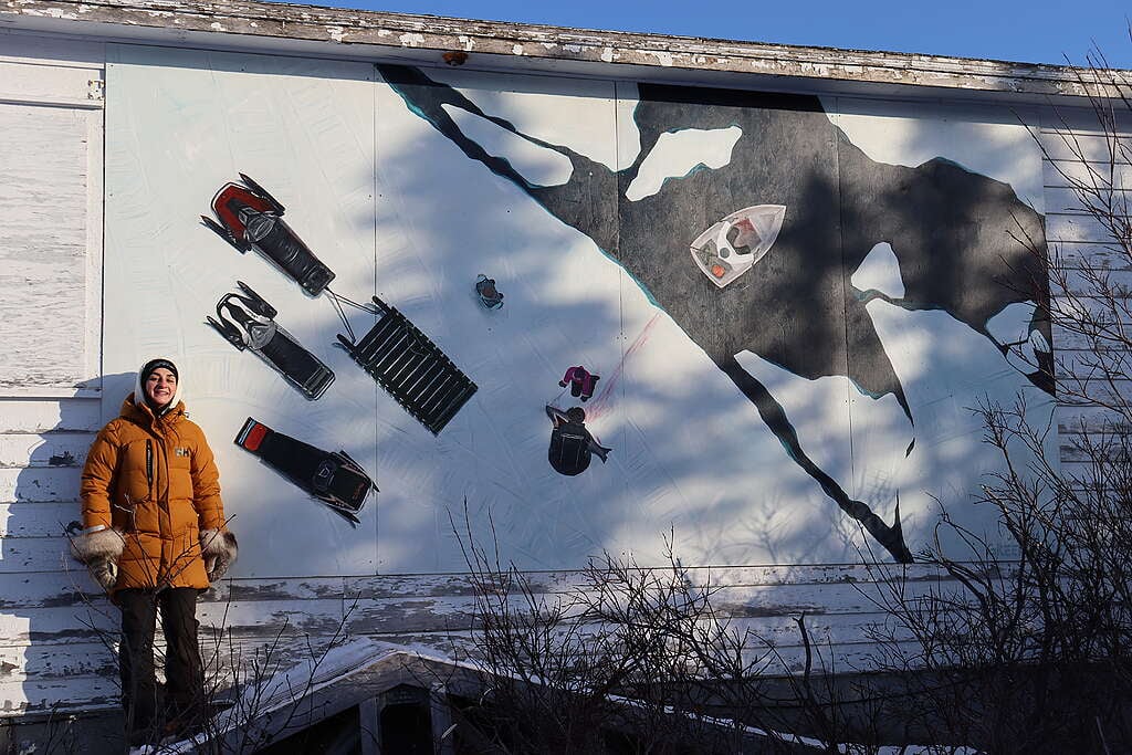 In Jessica’s own words, “This mural depicts a family hunting seals at the sina (ice edge), a scene commonly experienced in my home community of Makkovik. When Greenpeace Canada invited me to visualize Indigenous ocean stewardship, this was the most honest and natural expression of that relationship for me.