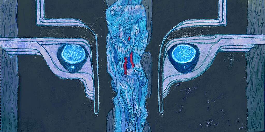 “With a core of fire, guarded by orca eyes, and shrouded in robes of bull kelp, the ocean is personified as an autonomous being encircled by the rhythmic movement of salmon and eelgrass. This imagery was developed during an artist’s residency on Pender Island through conversations with residents, First Peoples, and local conservation groups. By embodying the sea in human form, the artwork attempts to shift our perception of the water from a mere resource to a living subject with inherent value, inviting a meditation on ocean stewardship and the environmental cost of unrestrained deep-sea mineral extraction.