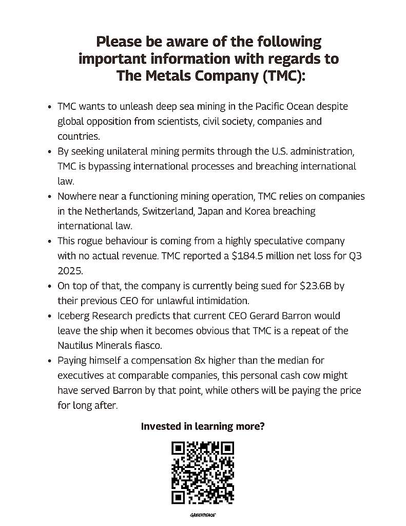 TMC stands to make millions of dollars from its endeavour that would drive ocean destruction in a region already resisting the impacts of climate change, industrial fisheries, and plastic pollution. They claim the minerals and metals from deep sea mining are needed for energy and security purposes. However, a new report by Greenpeace International shows that we don’t need deep sea minerals for an ambitious energy transition, and we certainly don’t need another tech-bro CEO like Gerard Barron to continue the legacy of exploitation and disregard for frontline communities and nature.