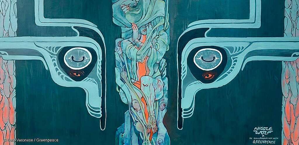 Dans cette fresque, l’océan prend la forme d’une figure féminine qui se défend contre la minière canadienne The Metals Company, actuellement en tête de la course à la destruction des fonds marins, et contre la violence extractiviste en général. L’œuvre captive par sa puissance et m’a fait réfléchir au fait que lorsque nous parlons de la Terre, nous la désignons instinctivement au féminin – la Terre-mère, la Terre-corps, et la Terre-source de vie. Je me demande si le fait de féminiser le monde naturel ne permet pas aux gens de se sentir plus facilement justifiés de l’exploiter.