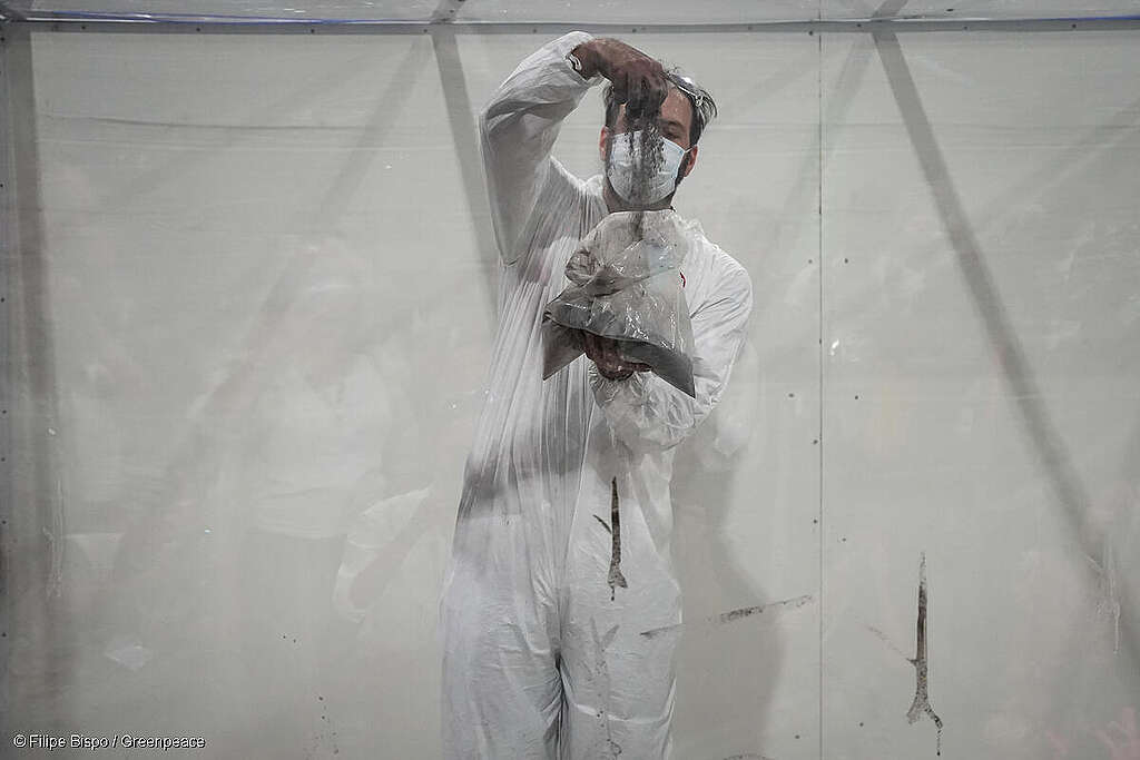 En una poderosa performance, el artivista brasileño Mundano, en colaboración con Greenpeace, reveló el mensaje “COP30: En pie por los bosques”. Para ello, utilizó cenizas reales recolectadas de incendios forestales que afectaron la tierra indígena Anambé, en la Amazonía, durante 2024.