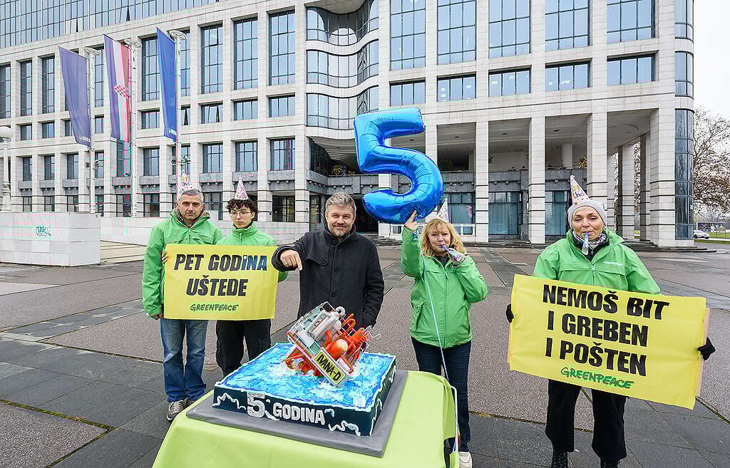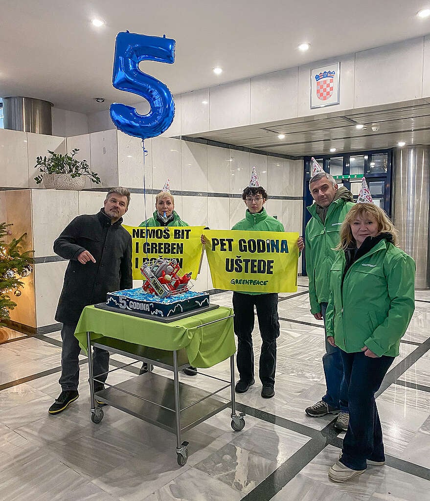Zagreb, 5. prosinca 2025. – Aktivisti Greenpeacea i Gradonačelnik Svemira Dario Juričan jutros su čestitali Ini na pet godina uštede zbog neuklanjanja plinske platforme Ivane D. Prigodno su Upravi Ine u Zagrebu namijenili veliku “slavljeničku” tortu. Ivana D potonula je u prosincu 2020. godine, a kompanija izbjegava obvezu potpunog uklanjanja konstrukcije platforme. Dario Juričan pohvalio je “lukavo” Inino rješenje da se platforma preimenuje u umjetni greben, a Greenpeace zatražio reakciju kompanije i nadležnog Ministarstva.