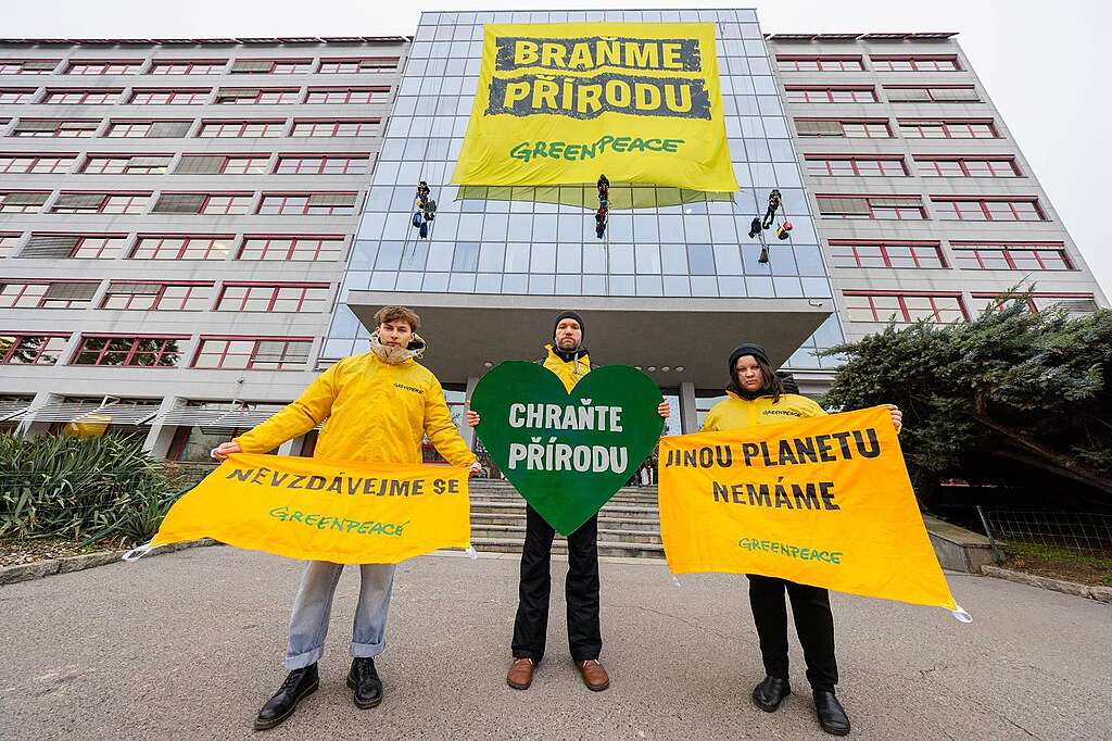 Aktivisté a aktivistkyGreenpeace Česká republika vyvěsili na budovu Ministerstva životního prostředí banner s nápisem Braňme přírodu“.  Jde o důležitý signál. Vedení tohoto důležitého úřadu přebírá Petr Macinka (Motoristé sobě). Je to předseda strany, která má ve svém programu rušení ochrany národních parků, zrušení principu bezzásahovosti v lesích nebo návrat Česka k uhlí. Proto je nanejvýš důležité, aby lidé zůstali aktivní a postavili se za přírodu a životní prostředí.