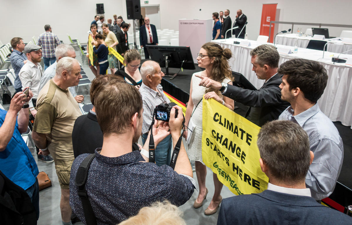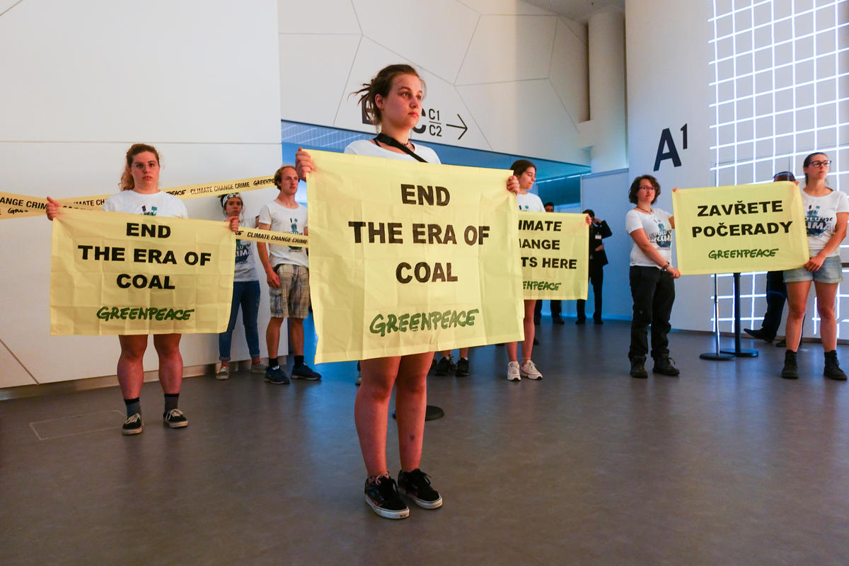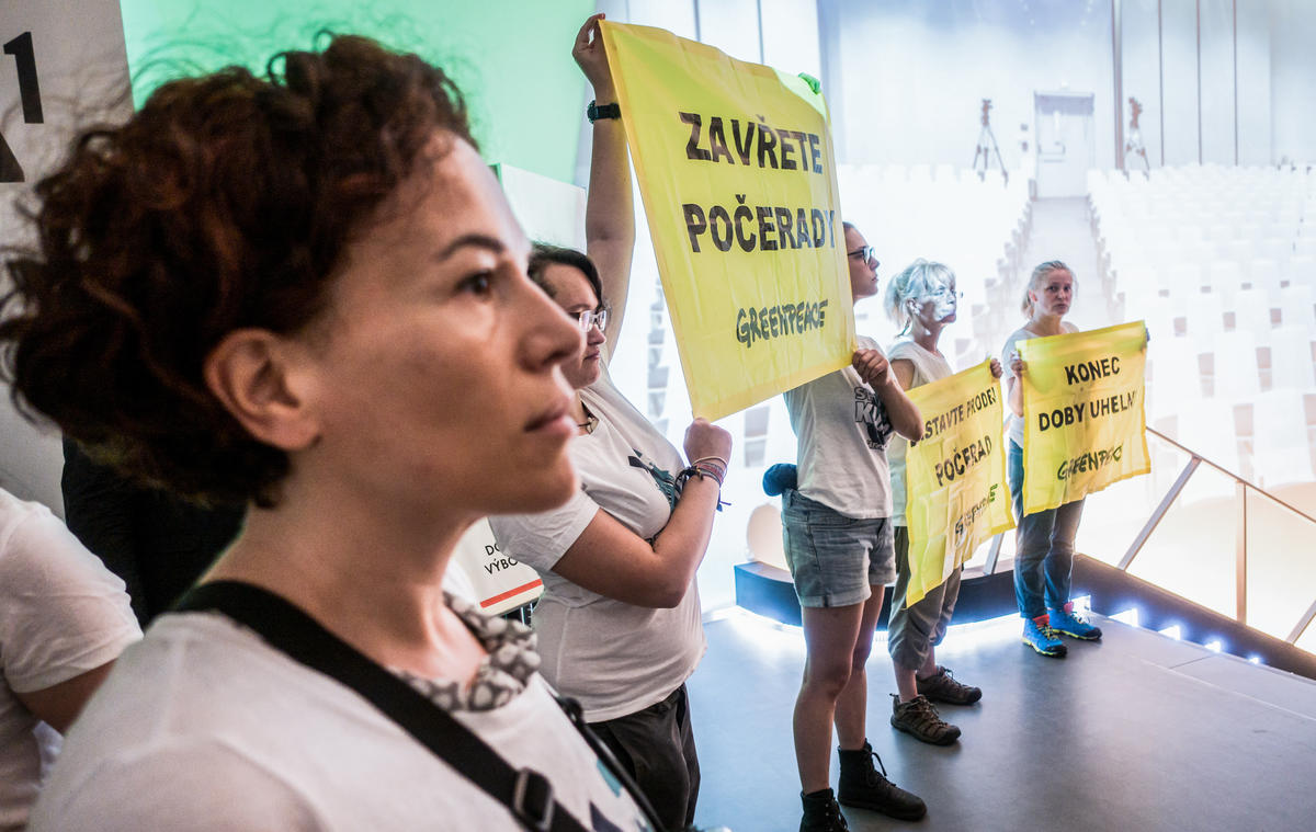 Před hlavním pódiem šest protestujících rozvinulo pásku s nápisem “CLIMATE CHANGE CRIME SCENE”, další desítky aktivistů a aktivistek pak protestují před vstupem do konferenční místnosti. V rukách mají transparenty vybízející k uzavření elektrárny Počerady a ukončení doby uhelné. Prodejem své největší uhelné elektrárny Počerady do soukromých rukou totiž může ČEZ zničit státní klimatické a energetické plány a uhelnému průmyslu v Česku zajistit další desítky let života.