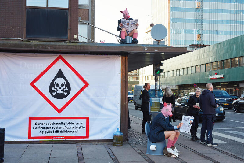 Torsdag morgen tog en gruppe Greenpeace-aktivister drikkevandssagen i egen hånd. De mødte op foran Axelborg i København – hovedsædet for Landbrug & Fødevarer – og erstattede lobbygigantens egne reklamer med store, røde advarselssymboler.