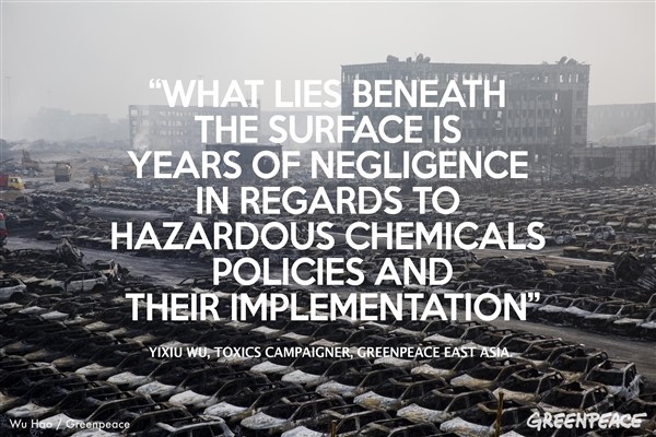 Over the years Greenpeace has campaigned for a toxic-free future.Whether it’s chemicals spilling in to our rivers from textile factories; or non-recyclable electronic products creating mountains of e-waste, the severity of the Tianjin explosion should be a wake-up call for the government in China and around the world. Loopholes must be closed, and regulations must be implemented strictly and effectively. If not, we will continue to see these kinds of dangerous accidents polluting our water, poisoning our air and ruining our cities.