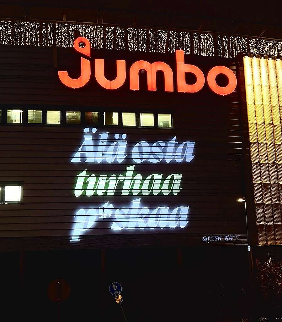 Greenpeacen aktivistit heijastivat torstai-iltana Suomen suurimman kauppakeskuksen, Jumbon, seinään jättikokoisen Black Fridayn holtitonta kulutushurmosta kritisoivan viestin. Tempauksellaan aktivistit haluavat muistuttaa, että Black Friday ruokkii ylikulutusta, joka puolestaan kiihdyttää yhä pahenevaa ilmastokriisiä ja luontokatoa.