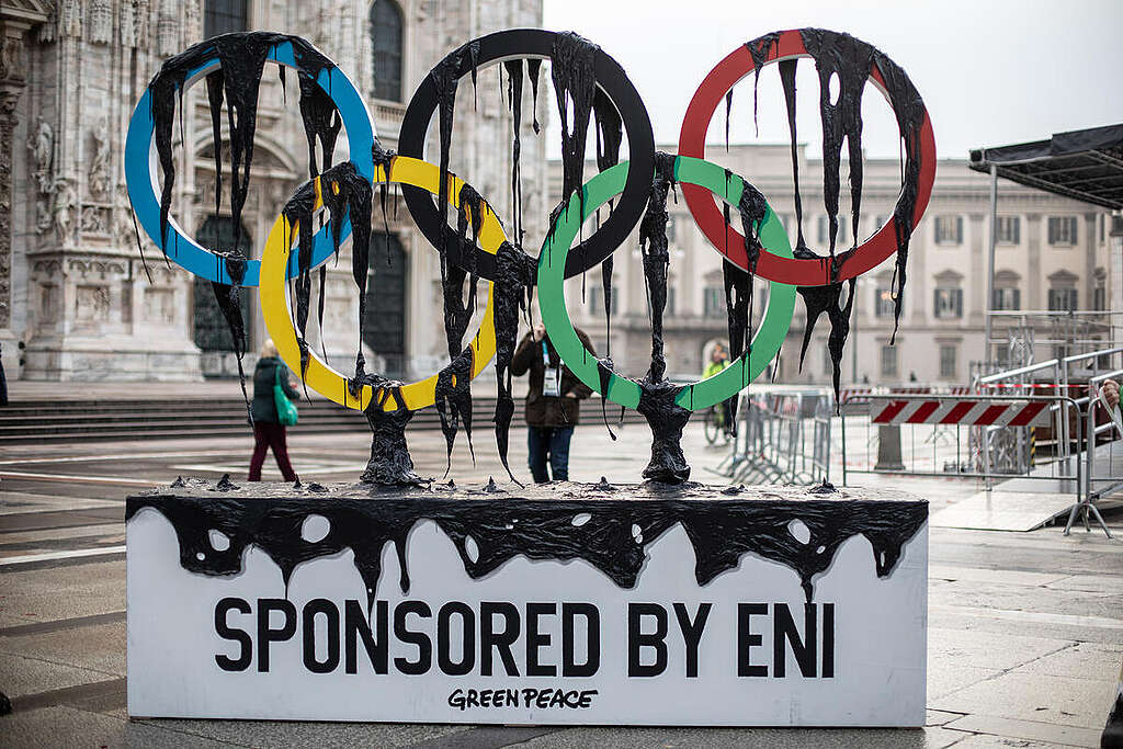 Greenpeace vaatii Kansainvälistä olympiakomiteaa (KOK) luopumaan yhteistyöstä öljy- ja kaasuyhtiöiden kanssa talviolympialaisissa ja talviparalympialaisissa. Italialainen Eni on yksi Milano-Cortinan talviolympialaisten (tai öljympialaisten) pääsponsoreista. Fossiiliyritysten pitäisi maksaa aiheuttamistaan ​​vahingoista, eikä puhdistaa julkisuuskuvaansa sponsoroiden olympialaisia.
