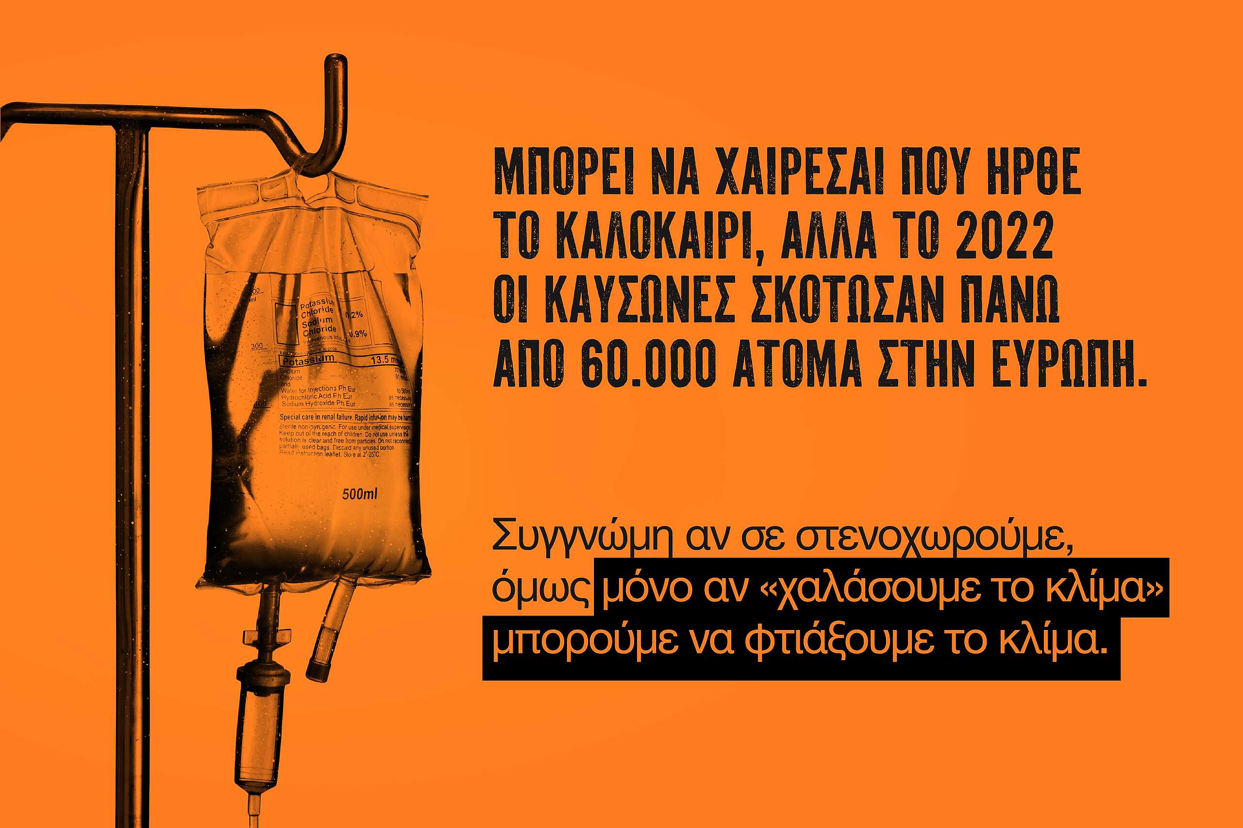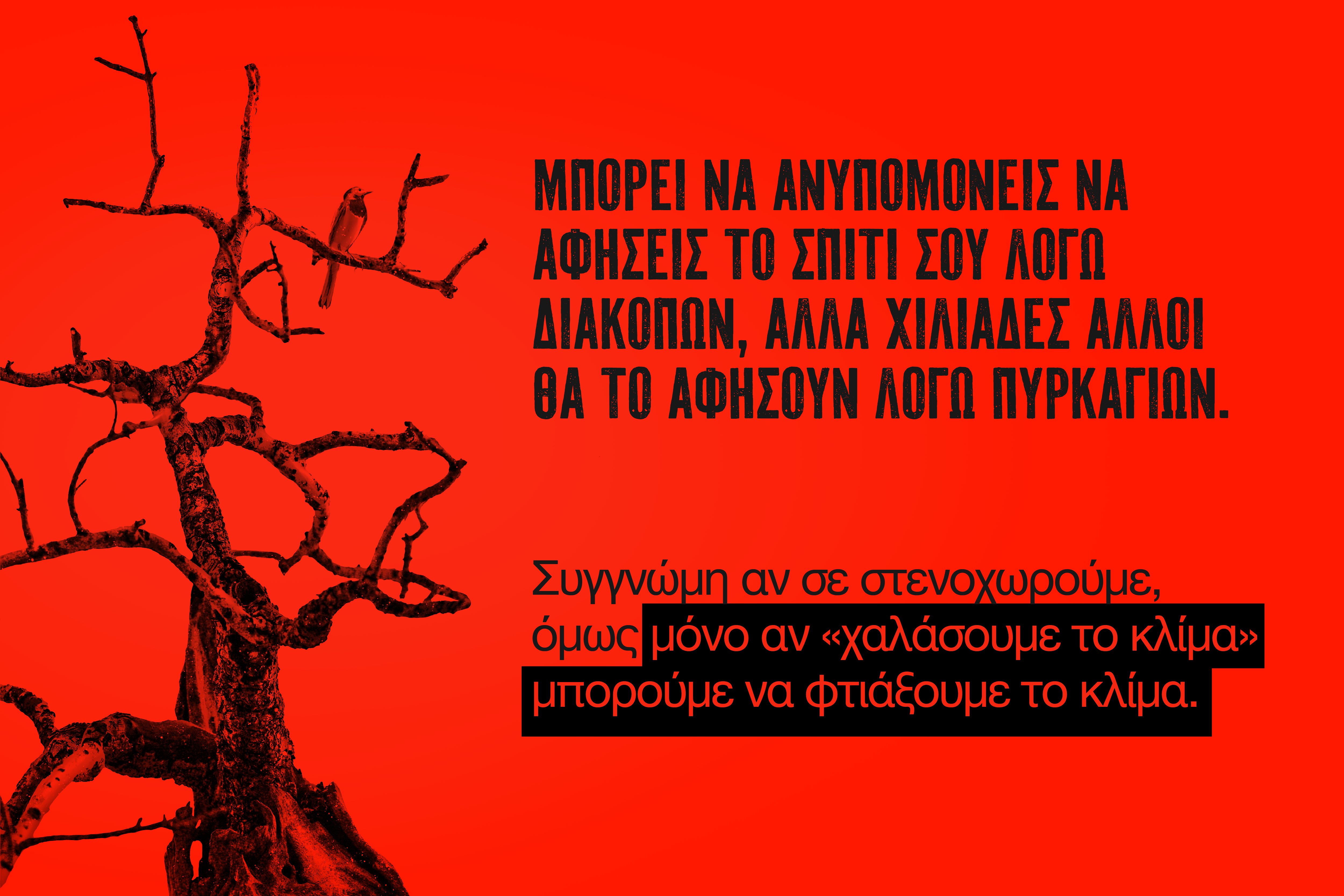 Δεν έχουμε χρόνο να αφήσουμε τα δυσάρεστα συναισθήματα και το κλιματικό άγχος να μας καταβάλλουν. Αναλαμβάνουμε δράση για την κλιματική κρίση και δουλεύουμε για να μπει τέλος σε πρακτικές που αφήνουν τον πλανήτη και εμάς απροστάτευτους απέναντι στις επιπτώσεις της: καύσωνες, ξηρασίες, πλημμύρες, όλο και πιο ακραία καιρικά φαινόμενα, κατάρρευση των οικοσυστημάτων.