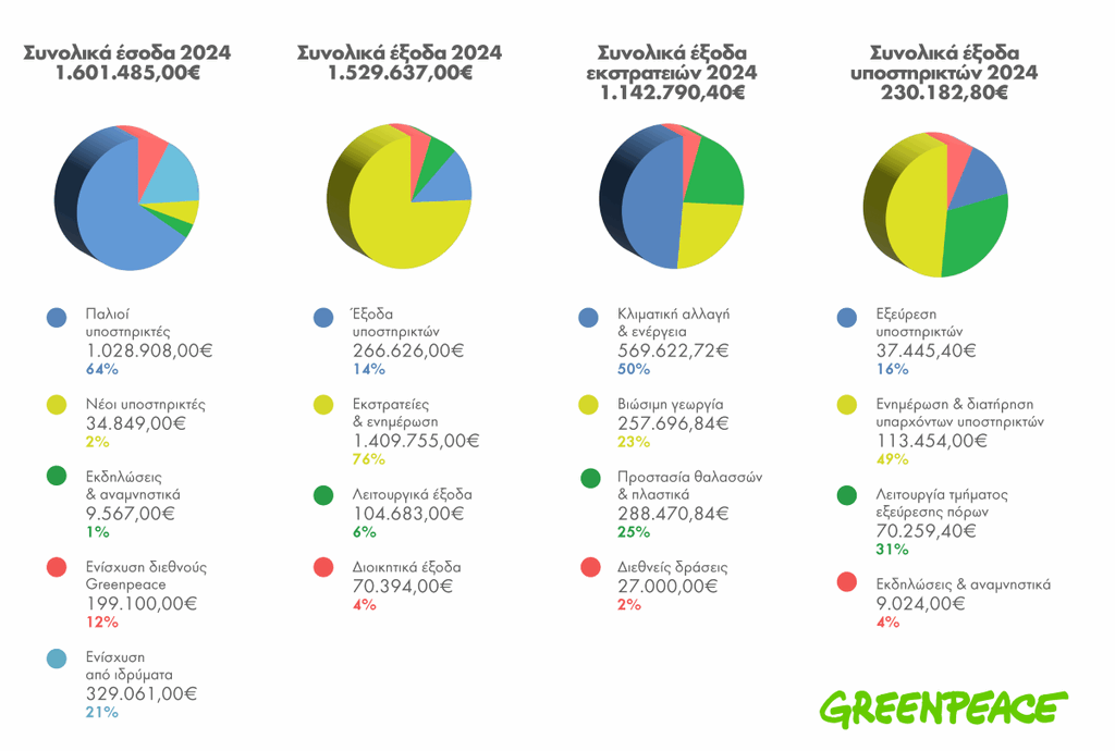 Η οικονομική στήριξη όσων είναι στο πλευρό μας δεν είναι απλώς ένας αριθμός. Είναι η εγγύηση της ανεξαρτησίας μας: χάρη σε αυτή, ερχόμαστε σε άμεση αντιπαράθεση, χωρίς δεύτερη σκέψη, με εταιρείες, κυβερνήσεις ή οποιονδήποτε βλάπτει τον πλανήτη και κάθε μορφή ζωής πάνω σε αυτόν. Η μοναδική μας δέσμευση είναι απέναντι στους 10.601 οικονομικούς υποστηρικτές. Στόχος μας είναι να μετατρέπουμε κάθε υποστήριξη σε ουσιαστικό έργο, γι’ αυτό κάθε χρόνο γίνεται ενδελεχής έλεγχος των εσόδων και των εξόδων μας από ανεξάρτητους ορκωτούς λογιστές, επιβεβαιώνοντας τη σωστή διαχείριση και τη διαφάνεια ως βασική μας αρχή. Κάθε ευρώ που μας προσφέρεται είναι η δύναμη που μας επιτρέπει να δρούμε εκεί που άλλοι σιωπούν.