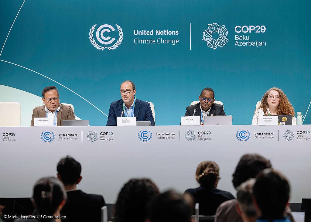 מסיבת העיתונאים האחרונה של גרינפיס ב-COP29 בבאקו. © Marie Jacquemin / Greenpeace
