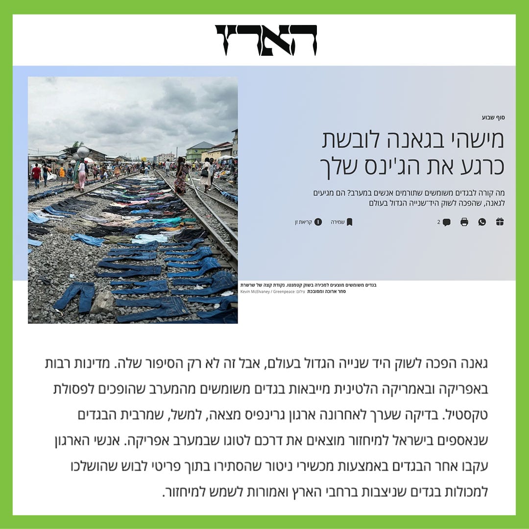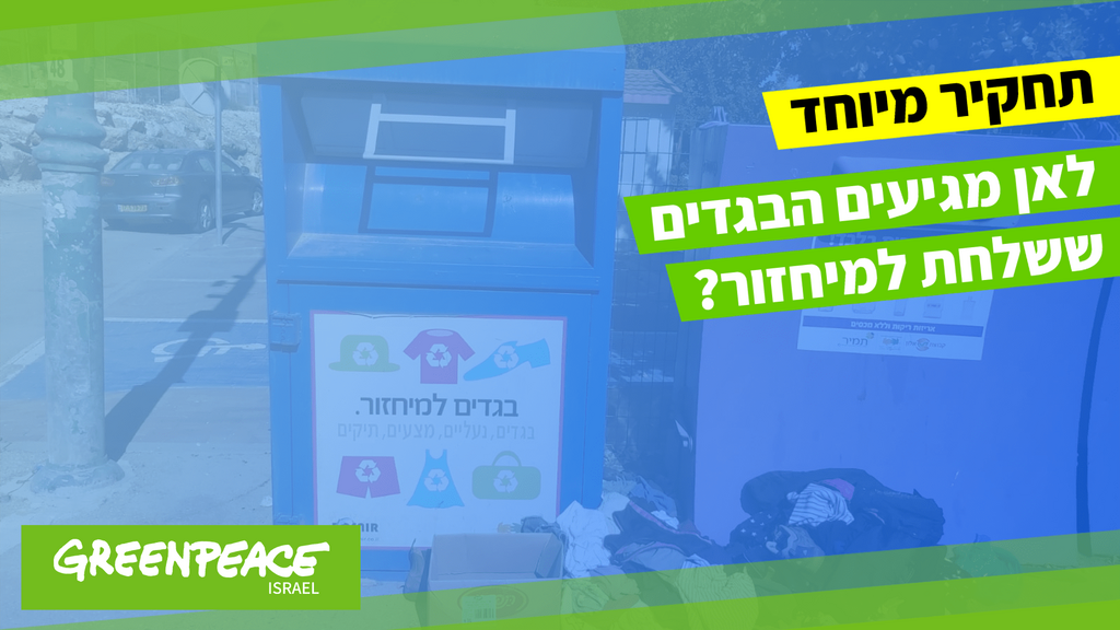המשרד להגנת הסביבה לוקח אחריות מסויימת ומטפל במגוון זרמי פסולת, ובהם: פסולת פלסטיק, אריזות, צמיגים, אלקטרוניקה ועוד, תחת חוקי אחריות יצרן מורחבת. בכל הנוגע לפסולת טקסטיל, מסתמך המשרד על כמה חברות פרטיות, הגדולה והמוכרת מביניהן היא חברת ״רוזניר״ – המגדירה את עצמה כחברה העוסקת במיחזור. חברות אלו קיבלו רישוי עסקי מהמשרד להגנת הסביבה, ללא כל מחויבות לדווח על כמות פסולת הטקסטיל שהן אוספות, או מה בדיוק הן עושות איתה לאחר מכן. תחקיר גרינפיס ישראל, שהתפרסם לפני כשנה, חשף לראשונה שבגדים רבים שנזרקו לפחי ה״מיחזור״ נשלחים לאפריקה. בעקבות התחקיר והמאבק המשפטי, הודו בחברת רוזניר ש-77% מהבגדים שהם אוספים נשלחים לטוגו במערב אפריקה; 5% עוברים ריסוק ומיחזור: 15% הופכים למטליות בד ונמכרים לתעשייה ישראלית, כמו מפעלי ים המלח, ו-2% הולך להטמנה. בסוף השבוע התפרסמה כתבה מקיפה עם ד״ר מיטל פלג מזרחי, שיצאה למסע מחקר לנסות להעריך את ההשפעות הכלכליות והסביבתיות של סחר בבגדים משומשים על גאנה – יבואנית הבגדים המשומשים הגדולה בעולם. מוזמנים לקרוא את התיעוד הנדיר, שחושף מה קורה באמת לבגדים שלנו אחרי שהם נזרקים ״למיחזור״.