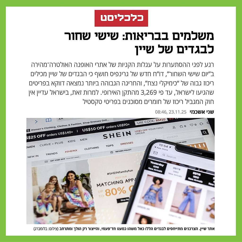 אופנה מהירה, או אולטרה-מהירה במקרה של ״שיאין״, היא בעיה מערכתית. יש כבר די והותר בגדים בעולם כדי להלביש את כולם עשורים קדימה. למרות זאת, התעשייה ממשיכה להציף אותנו בכמויות אדירות של בגדים זולים. על מנת לעצור את כניסת הרעלים לישראל, אנו דורשים פתרון אחד, ברור ומחייב: חוק אחריות יצרן מורחבת (EPR) לטקסטיל. חוק זה חייב לסגור את פרצת הייבוא האישי ולקבוע שכל פלטפורמה מקוונת (כמו ״שיאין״ ו״עלי אקספרס״) המוכרת ישירות לישראלים, תיחשב משפטית כ"יבואן" ותהיה אחראית באופן מלא לעמידה ברגולציה.