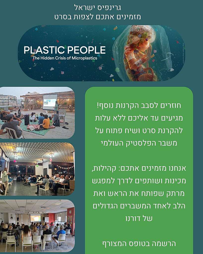 גרינפיס ישראל מזמין אתכם להזמין אותנו אליכם, להקרנה מודרכת ומיוחדת של הסרט הדוקומנטרי "People Plastic" – מסע דוקומנטרי עולמי בעקבות תעשיית הפלסטיק, שמאיימת על הבריאות שלנו, על הסביבה ועל הדורות הבאים.