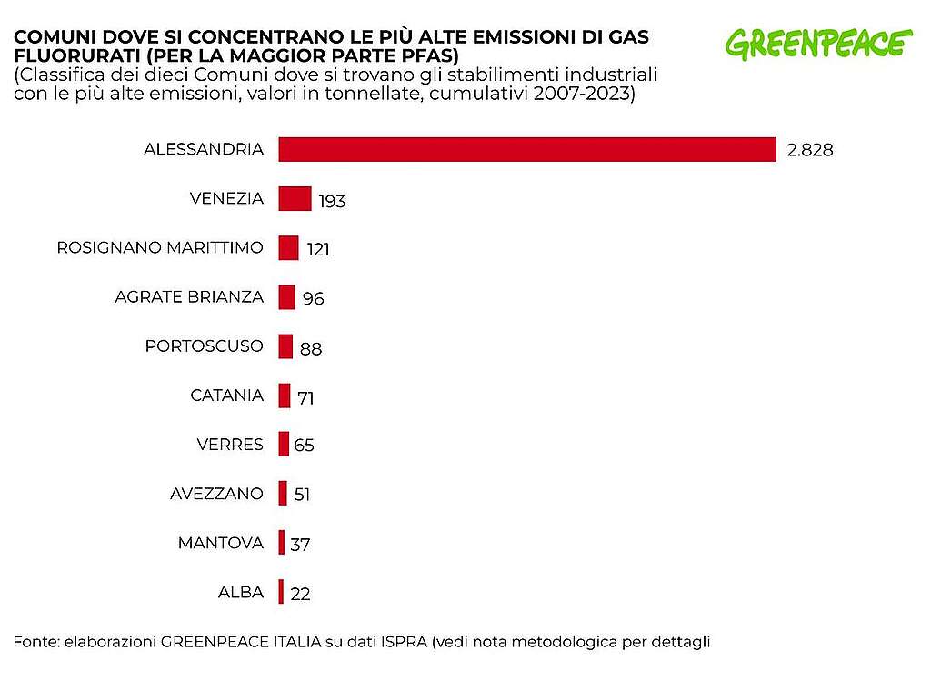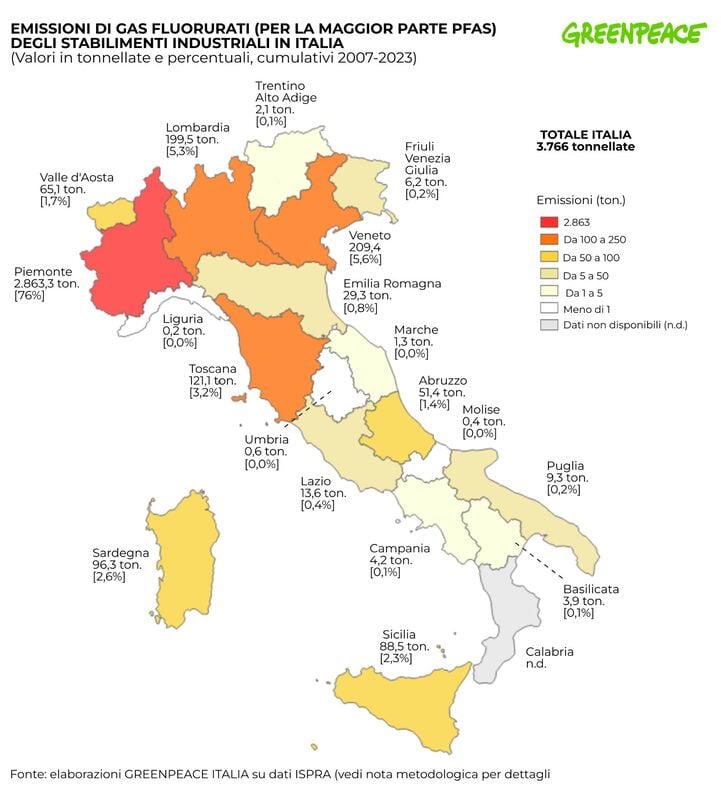 Il Piemonte risulta la Regione più colpita, con il 76% delle emissioni italiane di F-gas (2.863 tonnellate nel periodo 2007-2023). Il restante 24% delle emissioni è in gran parte attribuibile alle industrie localizzate in Veneto (in particolare nella zona di Venezia), Lombardia e Toscana.