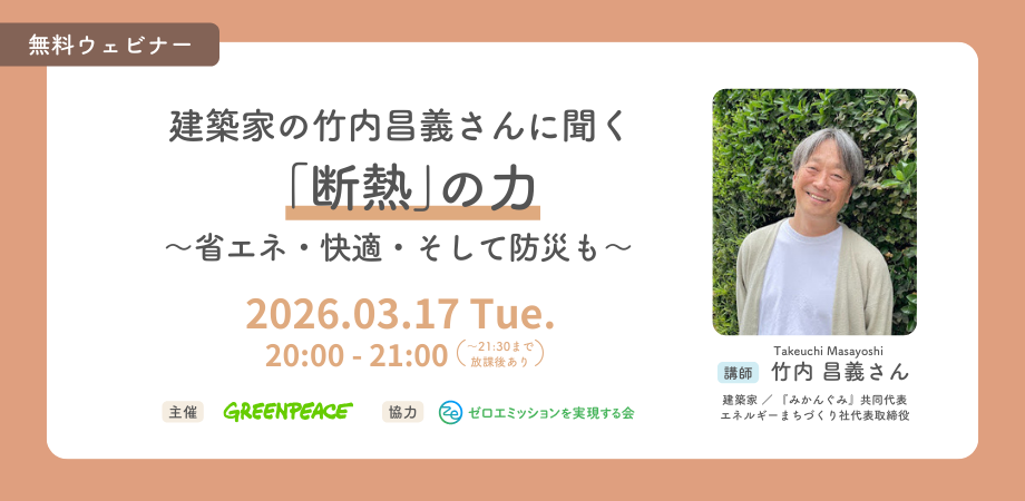 【3/17(火)20:00〜】建築家の竹内昌義さんに聞く「断熱」の力 〜省エネ・快適・そして防災も〜