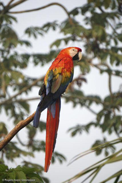 ニョオウインコは、ブラジル北東部の熱帯雨林に生息し、体長はおおよそ35cmほど、鮮やかな黄色の全身と羽の先端の緑色が特徴的です。その配色がブラジルの国旗と同じことから、同国でよく親しまれています。ニョオウインコは、高さ15〜30mの木の樹洞に卵を産むため、森林伐採によって成熟した大木や樹洞が伐採されると、繁殖率が低下してしまいます。また鮮やかな体色のため、密輸や個人飼育のための違法な捕獲の被害にもあっています。