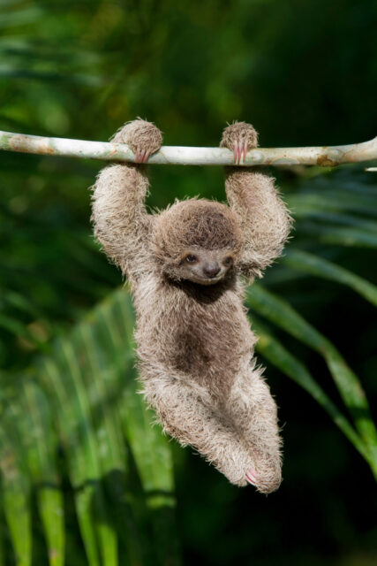 ゆっくりとした動きで有名なナマケモノ。中南米の熱帯林で、木にぶら下がりながら樹上で生活しています。木の葉を主食とし、代謝が非常に低いのが特徴です。体毛には藻が付着し、周囲に溶け込むことで天敵から身を守ります。近年は森林伐採によって生息地が急速に失われており、特にブラジルのナマケモノは一部(タテガミナマケモノなど)が絶滅危惧種に指定され、保護活動が進められています。