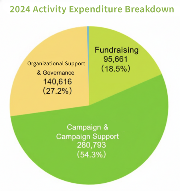 In 2024, the grant we received from Greenpeace East Asia was 22% more than the average over the past 3 years, and helped us to balance our income and expenditure. Greenpeace Japan’s income from donations was 14% less than last year. Our total income for 2024 was 517.07 million yen. Our expenditure was 15% more than last year, at a total of 517.07 million yen.
