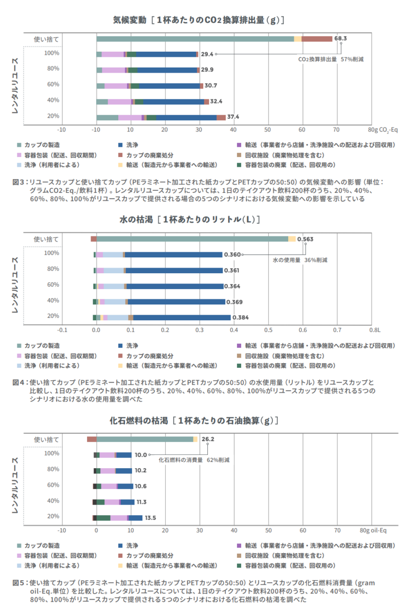 私たちは40店舗のネットワークを想定し、さまざまなリユースのシナリオを用意して調査しました。具体的には、コンビニやカフェのテイクアウト売り上げ量に対して、そのうち20-100%がレンタルリユースカップだった場合、使い捨てと比べて環境負荷はどれくらい変化するかといったことです。