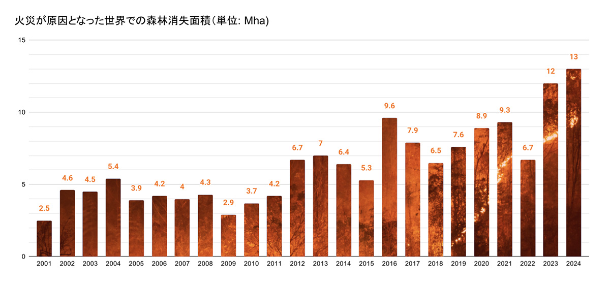 世界資源研究所(WRI)、他の研究所などの報告によると、2024年に世界で約67,000平方キロメートルの熱帯原生林が森林火災で失われ、焼失規模では過去最大であったことが明らかになりました。森林の消失原因の約半分が「火災」によるまでになりました。
