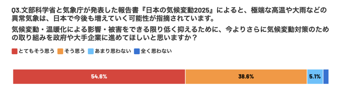 - 「今よりさらに気候変動対策のための取り組みを政府や大手企業に進めてほしいと思うか」との問いには、「とてもそう思う」「そう思う」合わせて93.2%に達した。